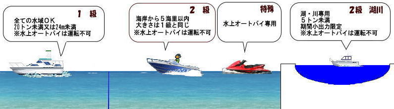 - 特殊は,水上オートバイ専用免許で,ボートは操縦できません。